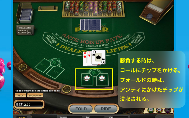 ディーラーが勝負から降りた場合の配当は、アンティに対する配当のみで、コールに賭けた分の配当はプレイヤーに戻ってきます。