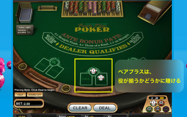 ペアプラスとは、役が揃うかどうかに賭けるサイドベットです。