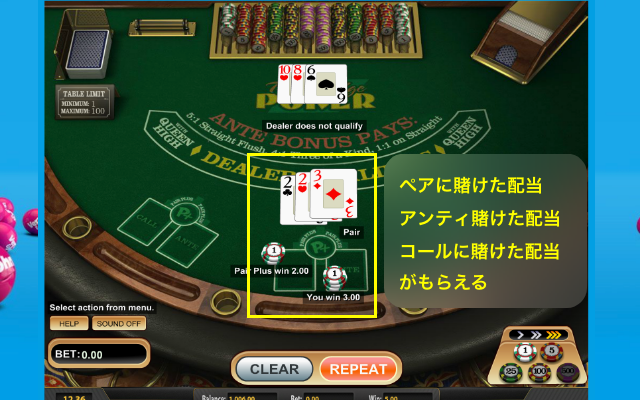 ペアプラスにかけて役が揃えば、アンティ・コールに対する配当だけでなく、プラスαでペアプラスに対する配当も貰えます。