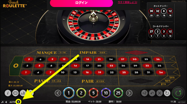 テーブルゲーム・ライブカジノにかかわらず、配当は画面の端にあるヘルプボタンから確認できます。