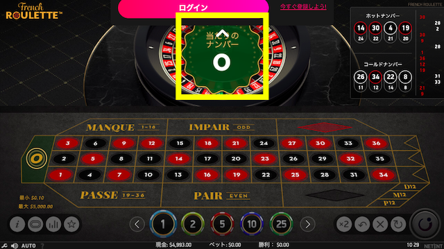 アンプリゾンは、『0』にボールが落ちた場合、ベットした賭け金の半額が返金されて、次のゲームで残りの半額が自動ベットされます。