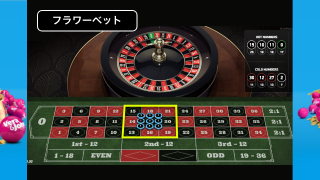 フラワーベット法は「0」を除いた1つの数字を基準にその周りの数字(8箇所)、合わせて9箇所にチップを賭ける方法です。そのため、コラムベットの3列のうち、真ん中の列の「2」と「35」を除いた数字どれかを基準にします。