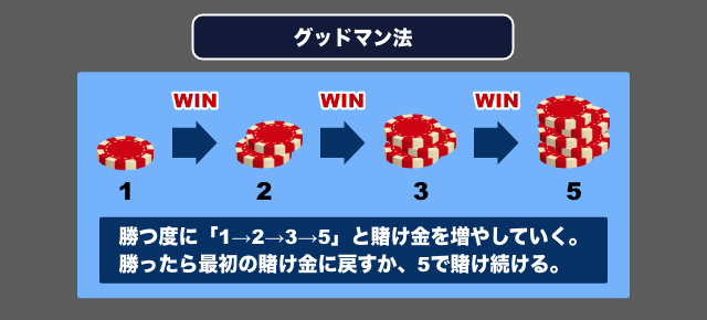 パーレー法と同じく連勝タイミングで使うものですが、賭け金は勝つごとに1⇒2⇒3⇒5の順に変えていきます。5回目以降の賭け金は変更しません。