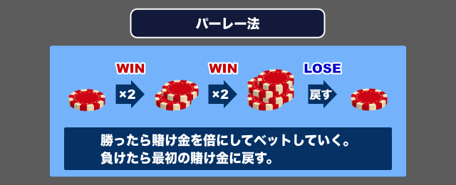 マーチンゲール法と正反対の手法で、パーレー法では勝ったら倍賭けしていきます。