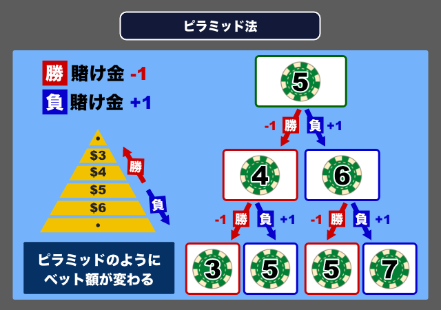 ピラミッド法の運用で連勝・連敗は関係ありません。勝ち・負けを基準に、勝ったら賭け金を1単位減らし、負けたら賭け金を1単位増やしていきます。