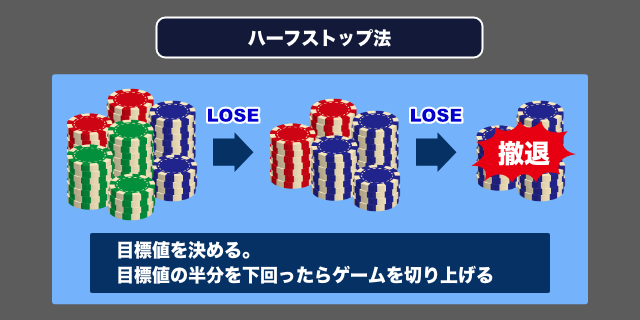 ハーフストップ法はどの賭け方にも使用できるチップコントロールです。ここまで紹介してきたものと少し異なり、利益が出たときの資金管理術になります。