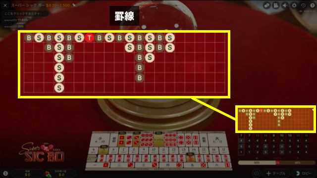 罫線とは、シックボーの勝負で出たサイコロの目を記録していく表です。