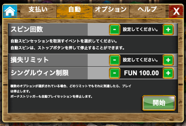 オートスピンの『⇆』ボタンを押すと以下の画面が表示されるので、スピン回数・損失リミット・シングルウィン制限などを設定して『開始』ボタンを押しましょう。