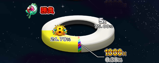 75%の確率でハズレを引くというリスクはあるものの、1/4の高確率でBIG WIN RUSHを狙えるのは魅力的です。1,000倍配当の当選確率も3つのカエルの中で最も高く設定されています。