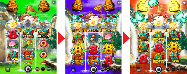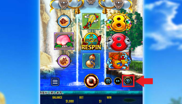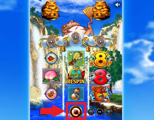 リスピンはその名前の通り、『スピンを再度行う』演出です。トリガーとなるシンボルは中国のお金がモチーフで、通常時にリスピンが揃う確率は1/25となっています。