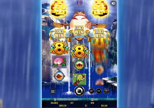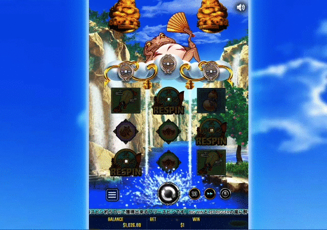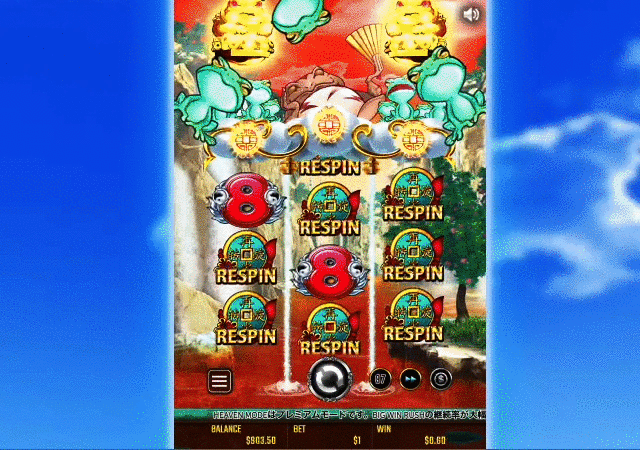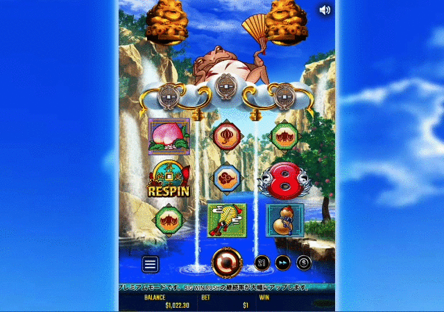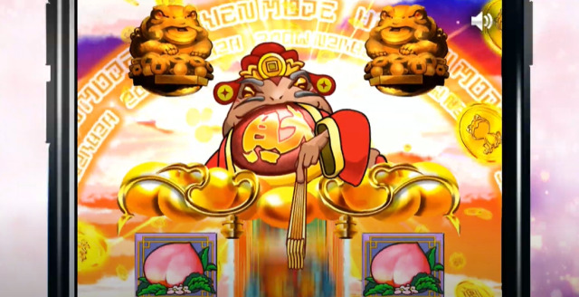 中華風のイラストと音楽に、カエルのキャラクターがモチーフとなっているユニークなスロットです。パチスロを意識したフリースピンや選択を迫られるボーナスモードなどの当たり演出が特徴的です。