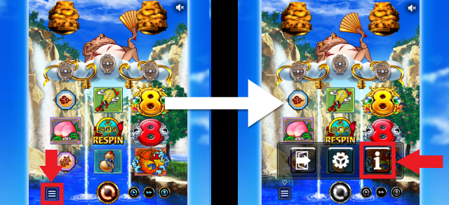 ハンバーガーアイコンをタップするとメニューの一覧に『i』アイコンが表示されるので、そこから配当表やルールなどの確認が可能です。