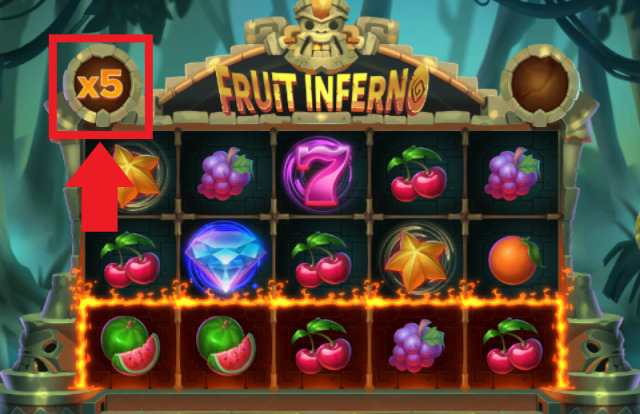 フルーツ・インフェルノでは、ファイヤーゾーンの内側でシンボルが揃ったときにマルチプライヤーのボーナスが発生します。