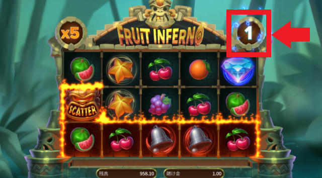 フルーツ・インフェルノは、通常スピンでの配当は低めに設定されているため、『ファイヤーフィーチャーにいかに突入できるか』が鍵になります。
