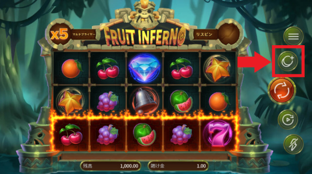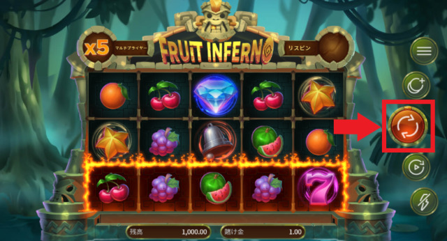 フルーツ・インフェルノにはリスピン機能も搭載されているので、リスピン×マルチプライヤーで高配当を狙っていきましょう。