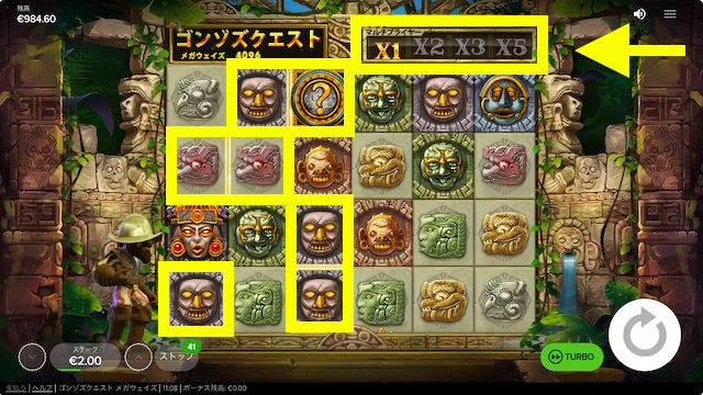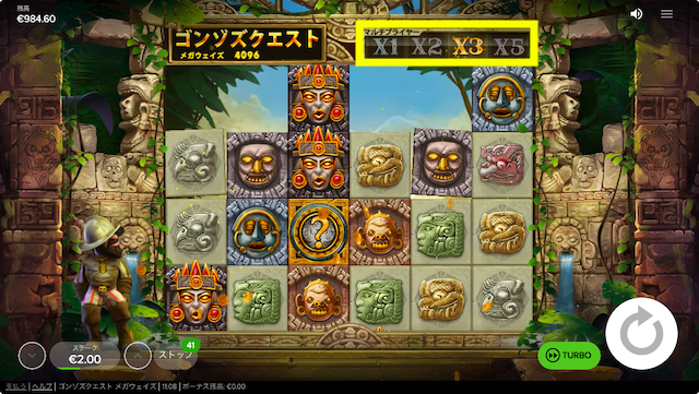 ゴンゾーズクエスト・メガウェイズのマルチプライヤーは、アバランシェマルチプライヤー呼ばれ、通常スピンなら最大5倍・フリースピンなら最大15倍まで上昇します。