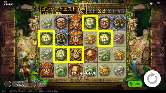 ゴンゾーズクエスト・メガウェイズの通常シンボルは、揃うと消えますが、ワイルドシンボルは揃っても消えません。