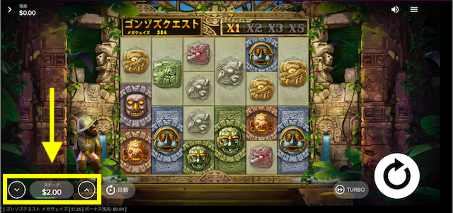 まず、ゴンゾーズクエスト・メガウェイズを起動したら好みのベット額を設定します。ベット額は、プレイ画面左下にある『ステーク』から設定可能です