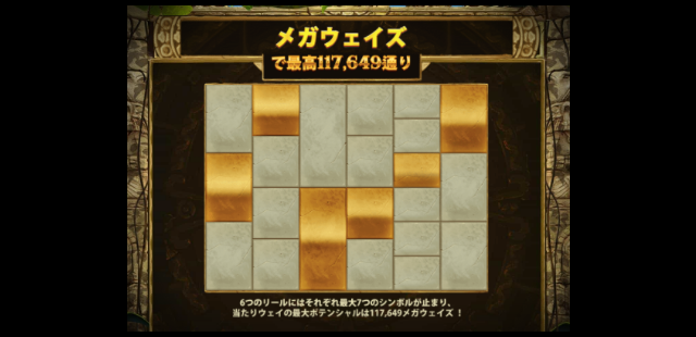 ゴンゾーズクエスト・メガウェイズのペイラインは最大117,649通りあり、リールごとに出現したシンボル数を全て掛け合わせて計算されます。