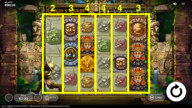 ゴンゾーズクエスト・メガウェイズは、同じシンボルが左側から順番に2〜3列以上出現すると配当成立となります。
