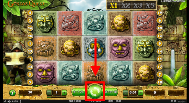 まず、ゴンゾーズクエストを起動したら好みのベット額を設定します。