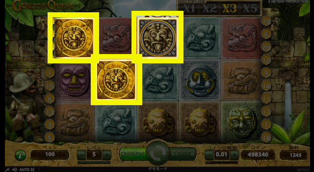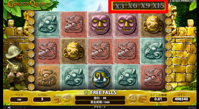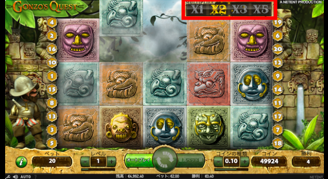 ゴンゾーズクエストのマルチプライヤーは、連続してシンボルが揃えば獲得できる配当が乗算されていくボーナス機能です。スロット画面の右上で乗算される数字が確認できます。