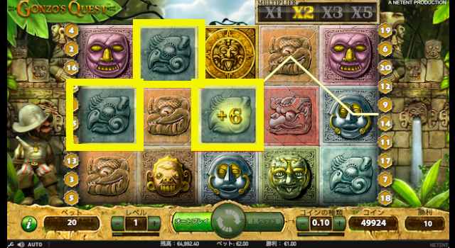 ゴンゾーズクエストのペイラインは全部で20ラインで、ペイライン上に同じシンボルが左から3個揃えば配当成立です。