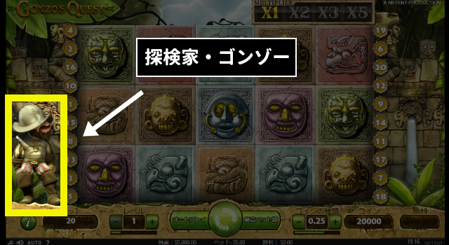 このスロットは主人公の探検家『ゴンゾー』がインカの古代遺跡を探検するというテーマで、5×3リールの20ペイラインのシンプルでわかりやすいシステムとなっています。