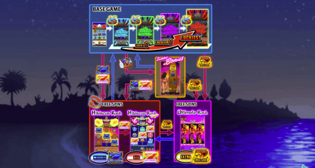 ハワイアンドリーム最大のフィーチャーボーナスである、アルティメットラッシュは金色の『7』シンボルが揃うと突入するフリースピンです。
