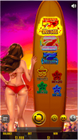 サンセットボーナスは、プレイ中に画面上に突如サーフボードで波乗りをするお姉さん(シンボル)が登場するボーナス演出です。