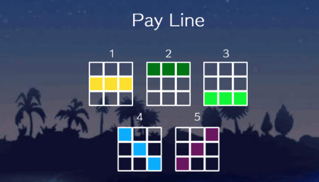 ハワイアンドリームのペイラインは上記の5ラインのみで、ペイライン上に同じシンボルが3個揃えば配当成立です。