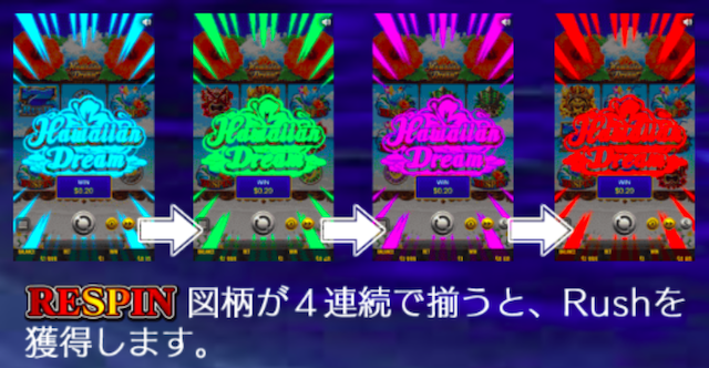 ハワイアンドリームでは、上記のリスピンシンボルがペイライン上に3つ揃うと払い戻しとは別に再度スピンできます。