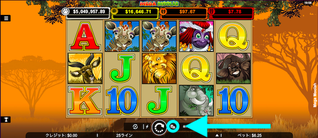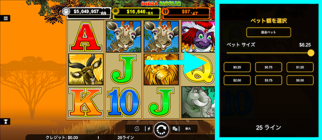 ベット額は$0.25〜$6.25まで調整可能なので、ベットサイズと書かれている直下のスライダーで操作するか、その下のベット額のボタンをクリックして一括変更できます。