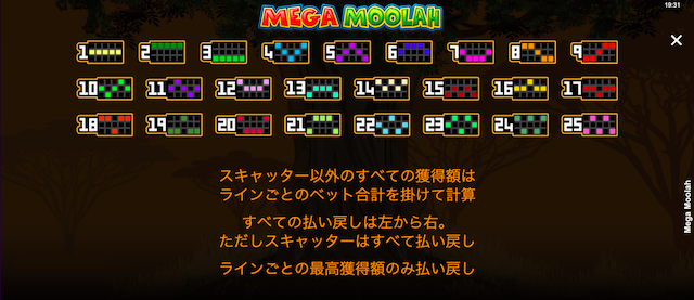 メガムーラのペイラインは全部で25ラインです。いずれもスピン後に左から順に2〜3個以上のシンボルが揃うことで配当成立します。