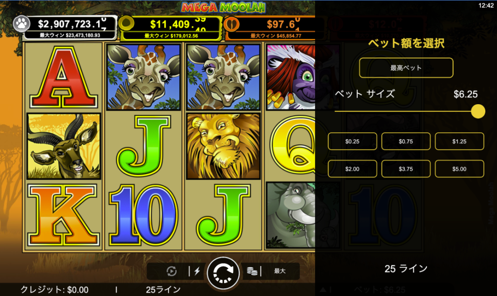 アフリカのサバンナがテーマのこのスロットは、オンラインカジノの中でも最もポピュラーなゲームの1つで、数億円以上のジャックポット当選者が数多く輩出されてきました。