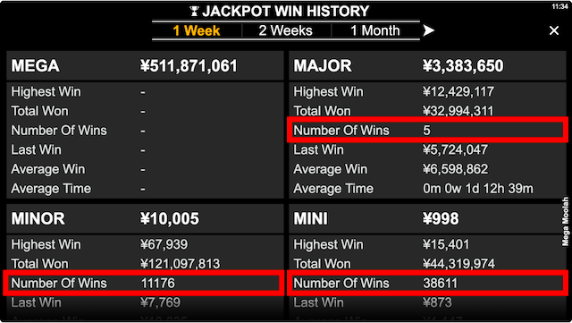 赤枠で囲った部分は過去1週間の当選回数となっていて、ジャックポットの『MINI』は1週間に38,611回もの当選者が出ていることがわかりますね。