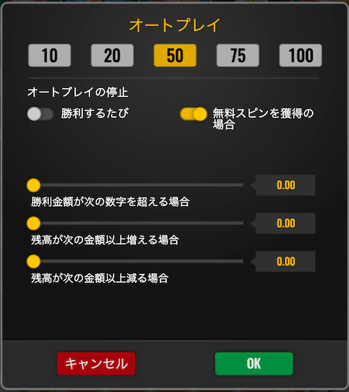 プレイ画面右下の『▶︎』ボタンではオートスピンの設定が可能で、スピン回数に加えて以下のような詳細な停止条件も設定できます。