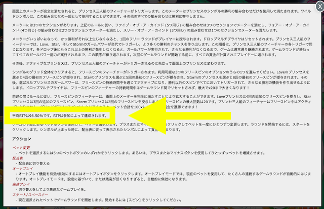 ムーンプリンセスの還元率は96.05%と、ビデオスロットの中でも高め設定です。