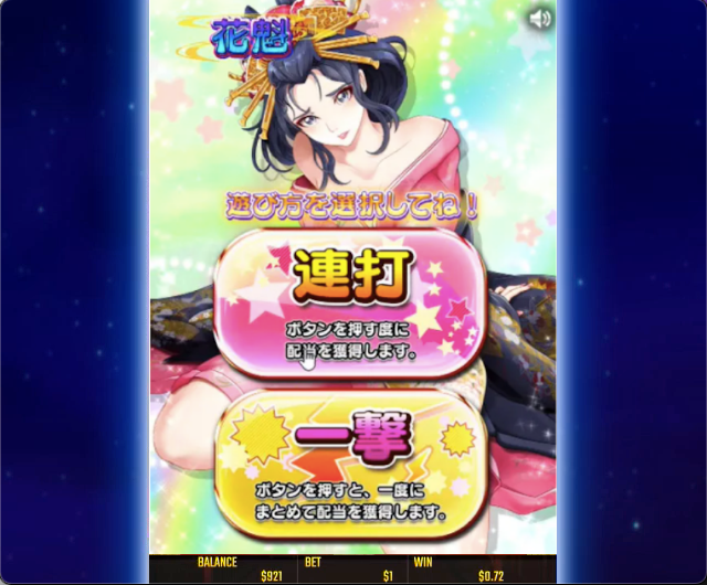 『連打』は、ボタンを連打しながら小刻みな配当獲得と花魁のセクシーな演出を楽しむことができ、『一撃』は1クリックのみで全配当金額を獲得できます。
