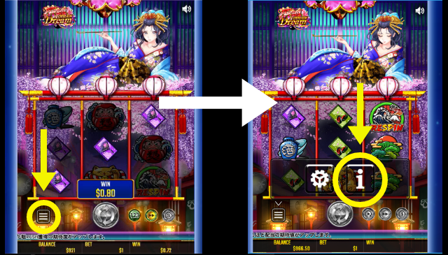 各シンボルの配当は、画面左下のハンバーガーアイコン内の『i』から確認できます。