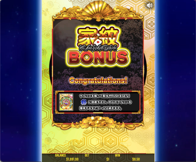 花魁ドリームでは通常スピンや、リスピン中にランダムで『家紋ボーナス』というボーナスゲームがランダムで発動します。