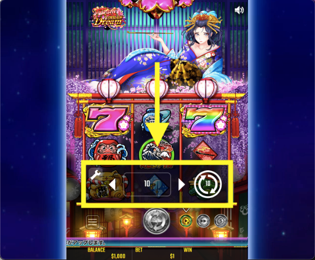まず花魁ドリームを起動したら、画面右下の『$』アイコンから好みのベット額を設定しましょう。