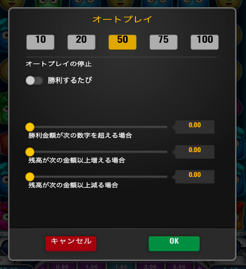 画面右下のオートプレイボタンをクリックすると、スピン回数や停止条件の設定画面が表示されます。