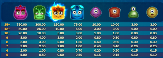 スロット上のどこでも、シンボルが5個以上揃えば配当成立となり、賞金の払い戻しが行われます。
