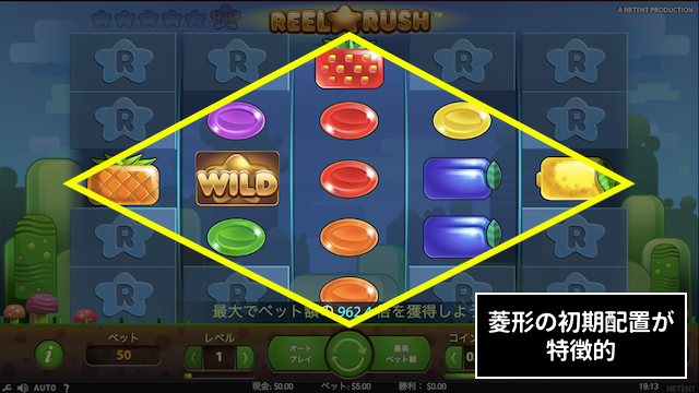一般的なスロットと異なってゲームスタート時のシンボルの配置がひし形となっているのが特徴で、ひし形の周囲のシンボルエリアは灰色の星マークでブロックされています。