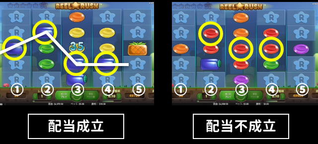 リール・ラッシュは、通常のビデオスロットと異なり、固定のペイラインは存在しません。配当の項目でも紹介しましたが、左から3列以上連続で同じシンボルが出現すれば配当が成立します。