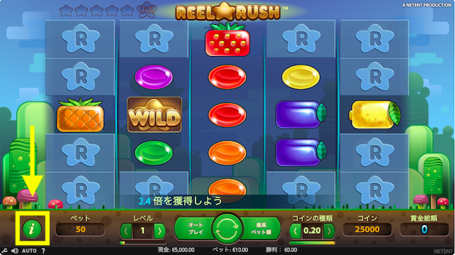 なお、各シンボルの配当は、プレイ画面左下にある『i』マークから確認できます。