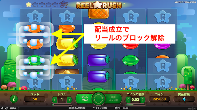 スピンの結果、同じシンボルが左から順に3列以上のリールに出現すると配当成立となり、リールのブロックが解除されて無料で再スピンが行われます。