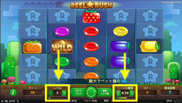 リール・ラッシュを起動後、まずは好みのベット額を設定します。