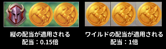 例えば以下の画像の場合、左側の『シンボル+ワイルド』では盾の配当金額が払い戻しされます。